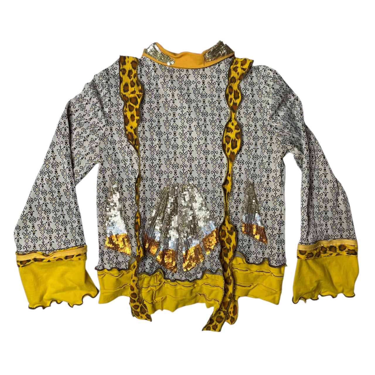 By repurposing a vintage top and incorporating remnants of leopard cord and sequin embellishments, the designer has imbued it with an unparalleled allure.